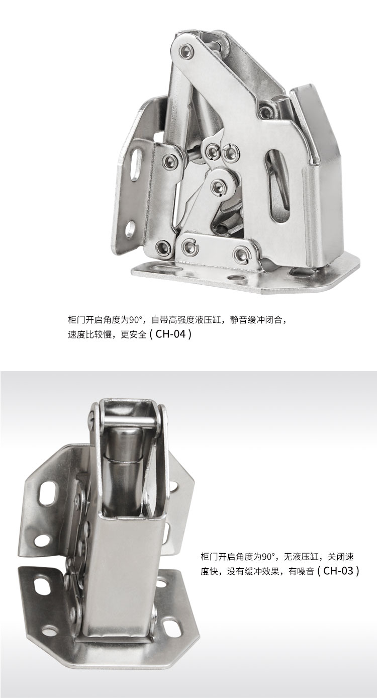 冷軋鋼房車(chē)吊柜緩沖鉸鏈 靜音緩沖 免開(kāi)孔 無(wú)需加裝氣撐 柜門(mén)自動(dòng)撐起 適用門(mén)厚8-20mm 開(kāi)啟角度90° 使用范圍房車(chē)吊柜、衣柜等