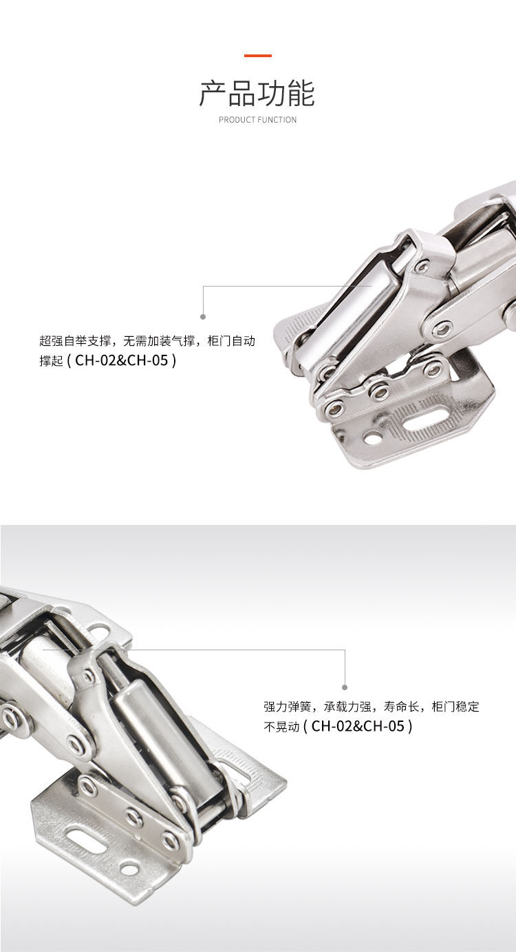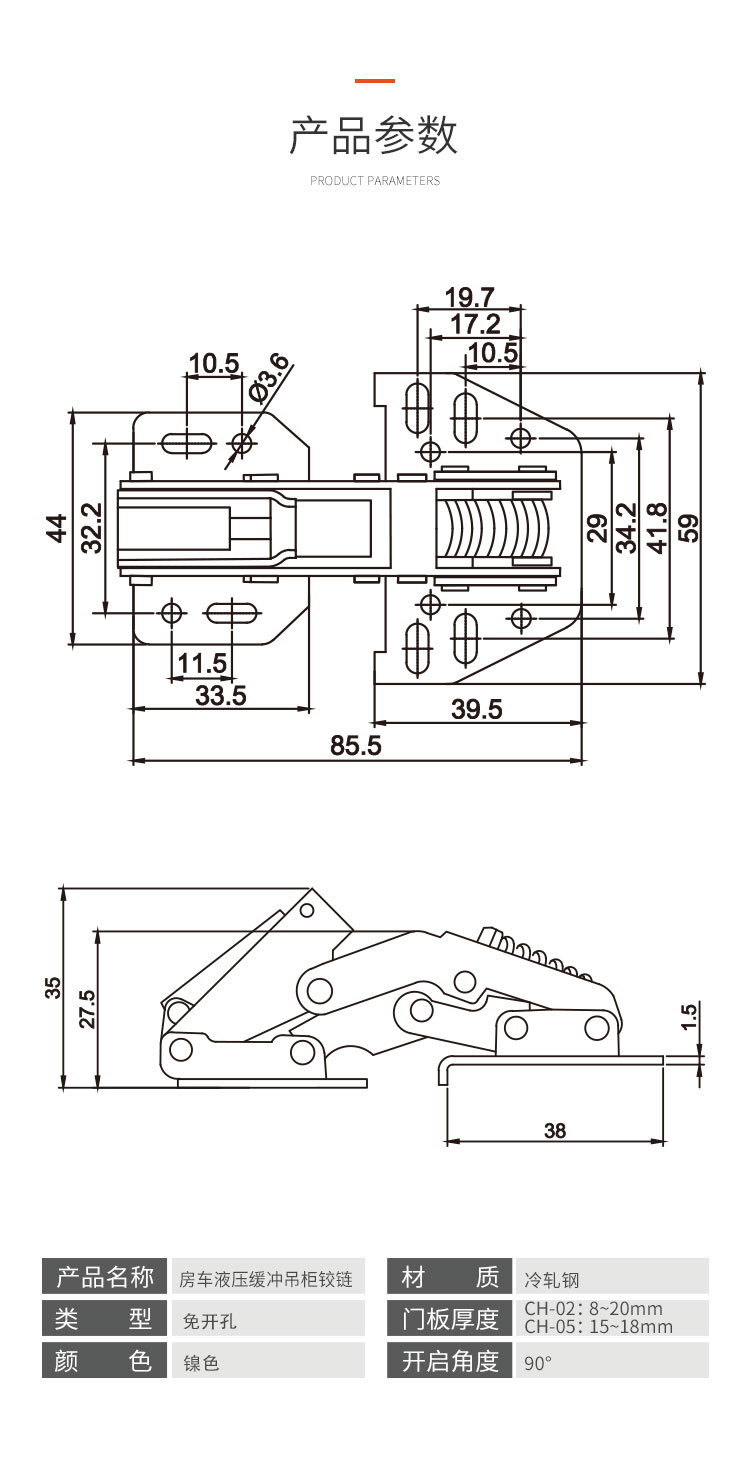 冷軋鋼房車吊柜緩沖鉸鏈 靜音緩沖 免開孔 無需加裝氣撐 柜門自動(dòng)撐起 適用門厚15-18mm 開啟角度90° 使用范圍房車吊柜、衣柜等