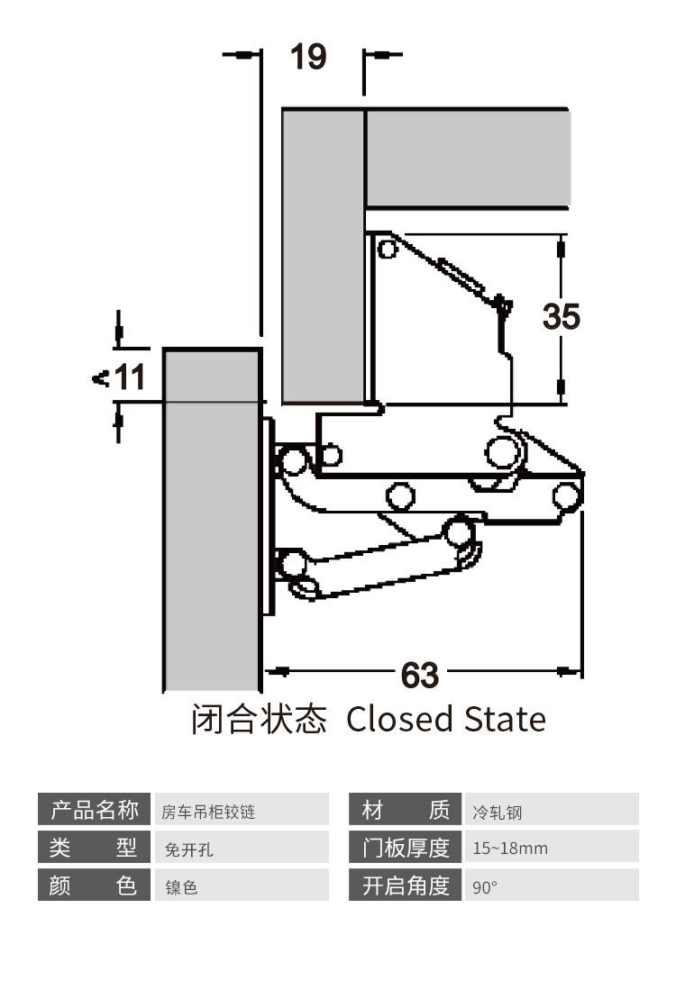 冷軋鋼房車吊柜鉸鏈 免開孔 無需加裝氣撐 柜門自動撐起 適用門厚15-18mm 開啟角度90° 使用范圍房車吊柜、衣柜等