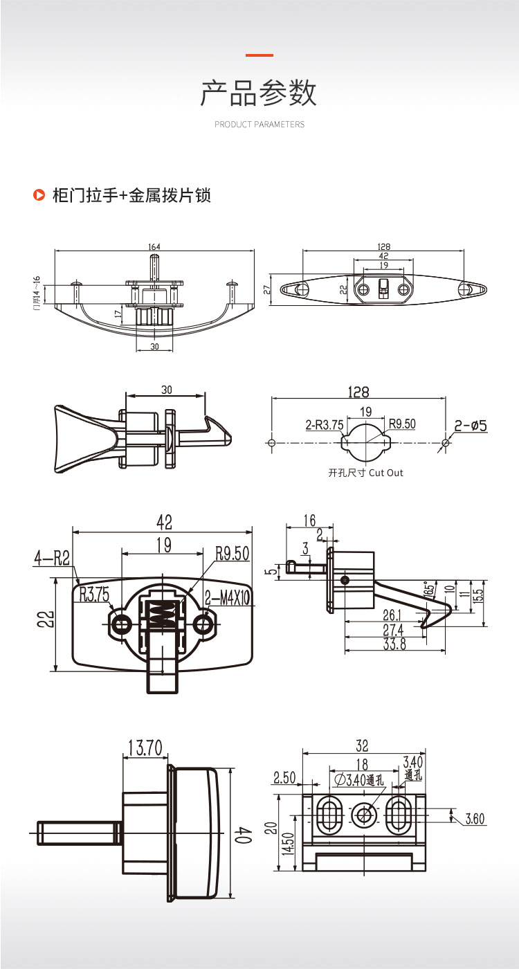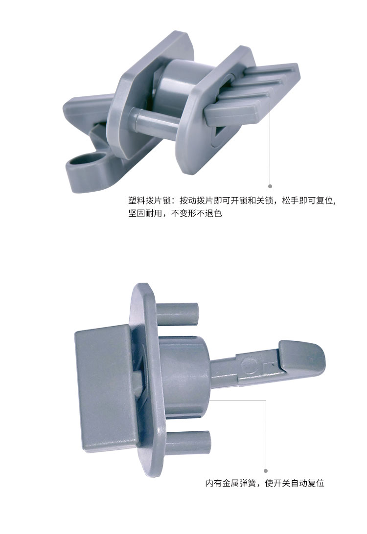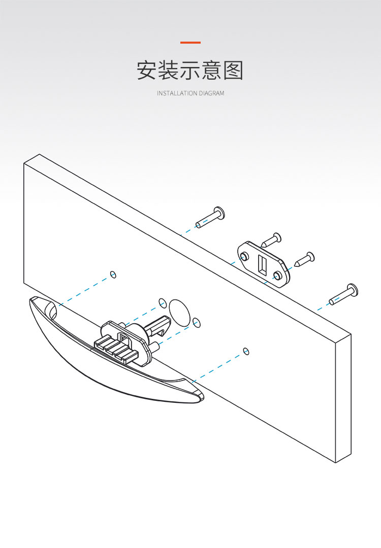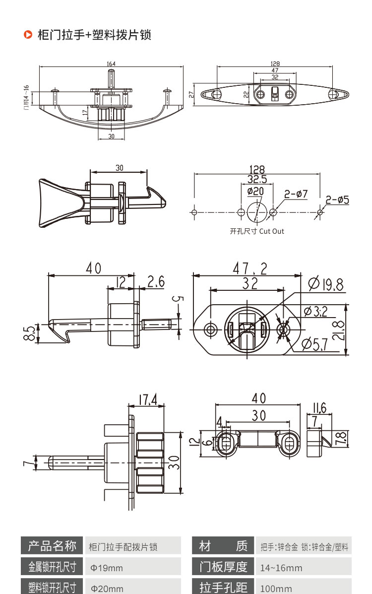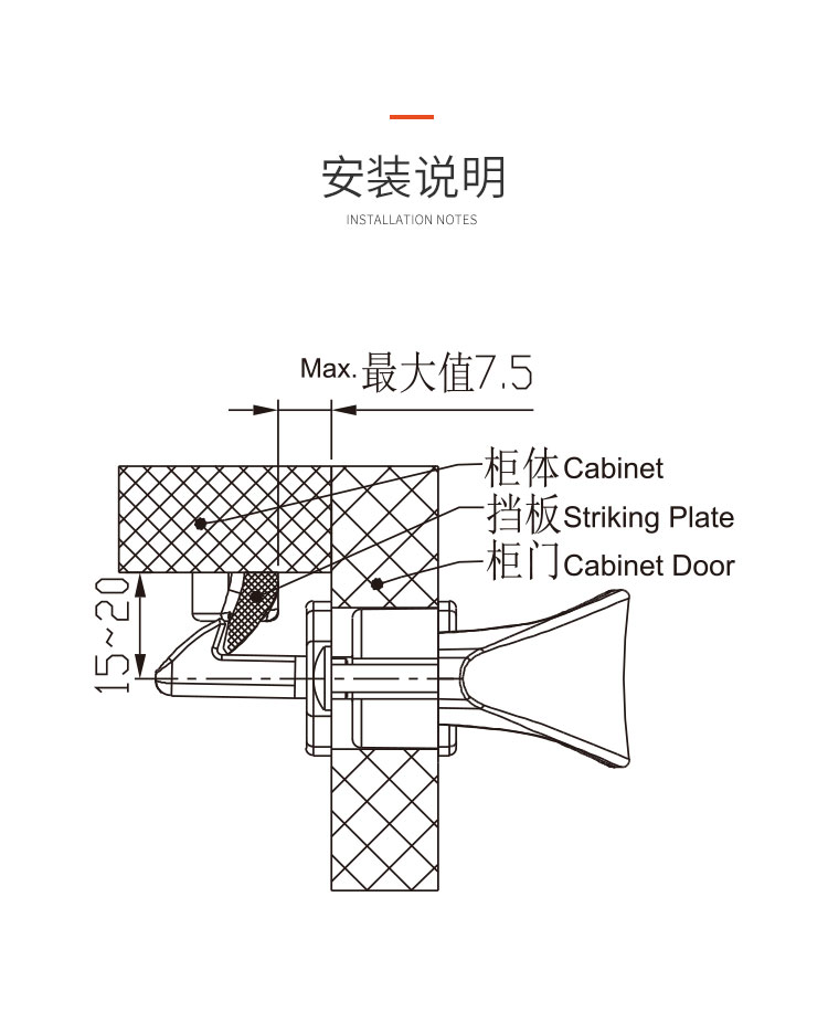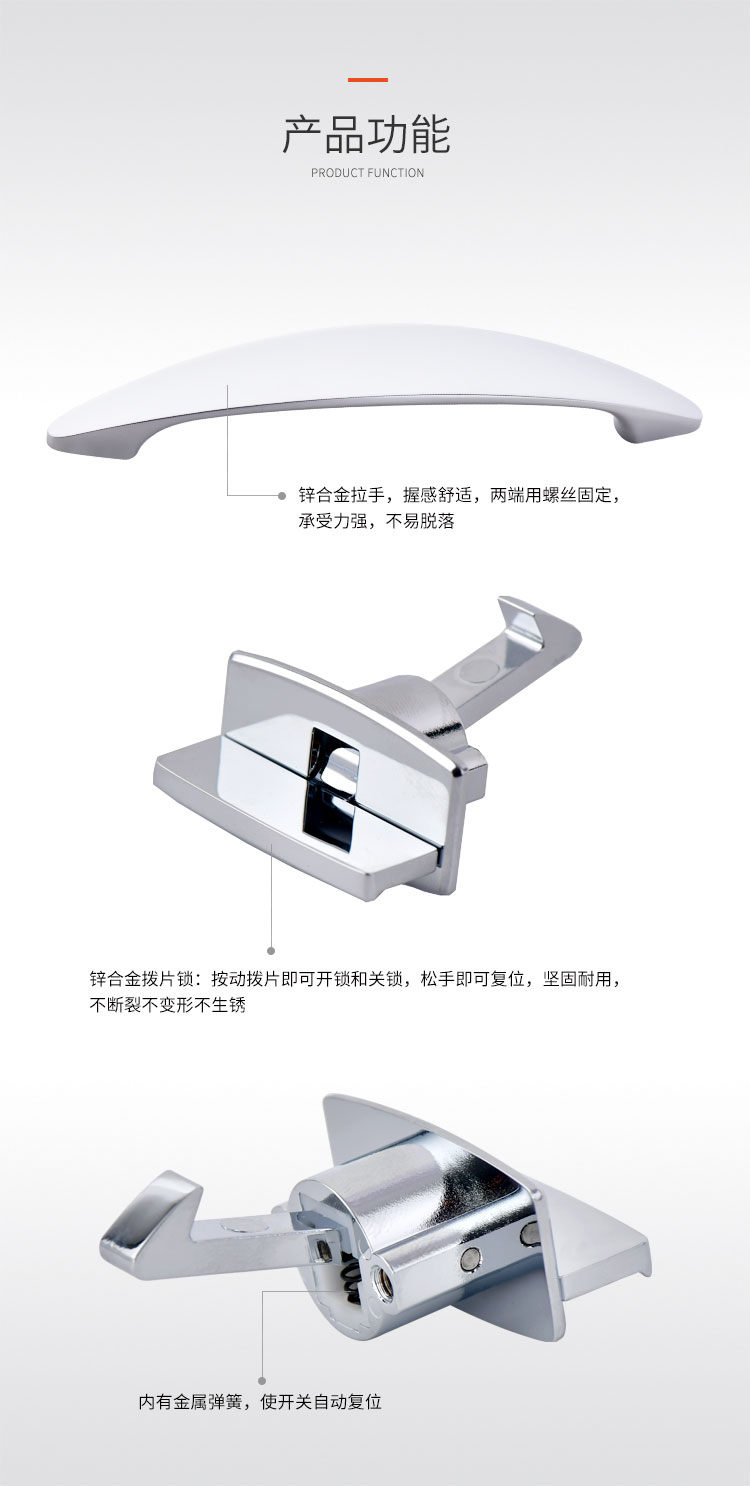 ·達(dá)中性鹽霧(NSS)測(cè)試200小時(shí)10級(jí)要求以上的檢驗(yàn),高于行業(yè)4倍以上耐腐標(biāo)準(zhǔn) ·材質(zhì):鋅合金&尼龍 門(mén)板厚度:14~16mm 開(kāi)孔尺寸:Φ:20mm