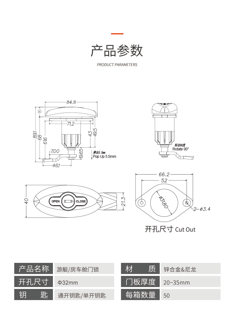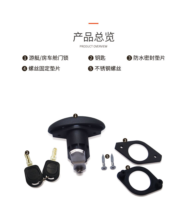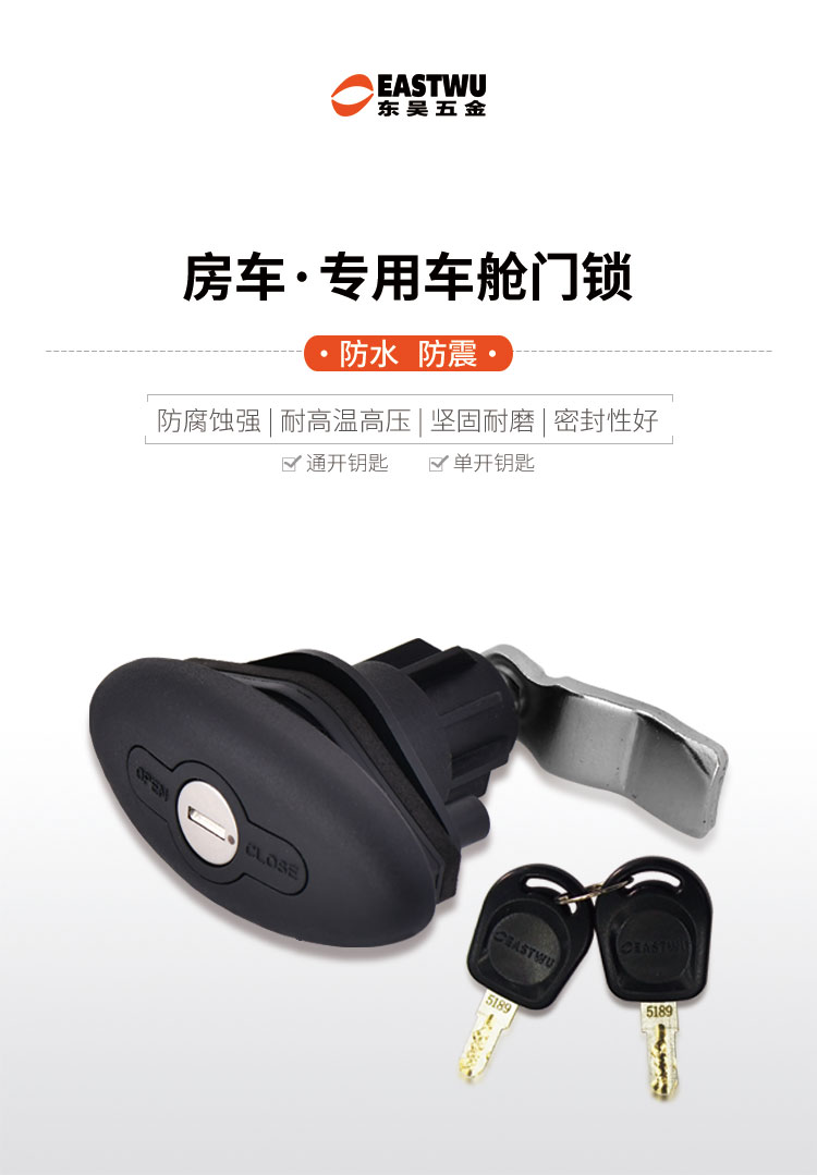 特點(diǎn):可定制與房車門鎖一樣的鑰匙,一把鑰匙就可以開房車上面的所有艙門鎖與門鎖。開孔尺寸φ32mm 鋅合金&尼龍材質(zhì) 適用門厚20-35mm